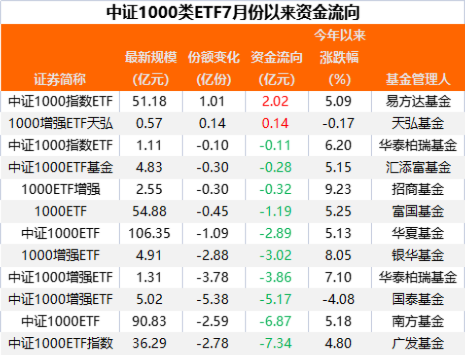 Wind统计显示,截至7月76日,市场上的12只中证1000ETF及增强策略ETF中,有10只基金份额较6月末均有不同程度减少。