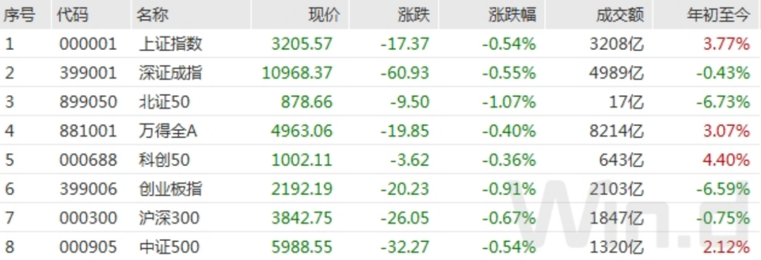 截至收盘,上证指数跌0.54%报收于3205.57点;深成指跌0.55%报收于10968.37点;创业板指跌0.91%报收于2192.19点,万得全A总成交8214亿元。此外,北上资金连续3天净卖出,进一步打压市场情绪。