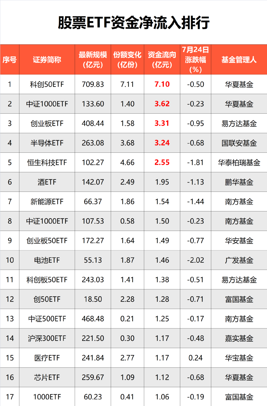从资金净流入排名看,在昨日震荡下行市场中,华夏科创50ETF最为吸金,单日净流入资金超过7亿元。另外,华夏中证1000ETF、易方达创业板ETF也是“越跌越买”,当日净买入资金超过3个亿。