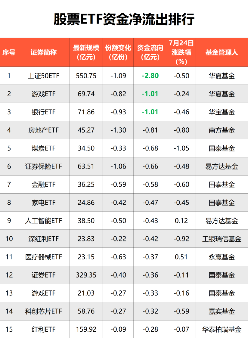 但在7月24日的市场下跌中,资金借道股票ETF依然越跌越买,单日净流入资金为53.06亿元。