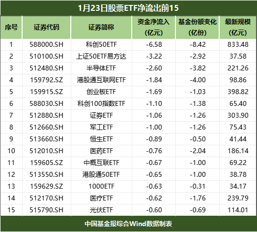 从股票ETF市场资金流向来看,1月23日基金份额净减少10.44亿份,按照当日成交均价测算,净流入资金约为29.2亿元。