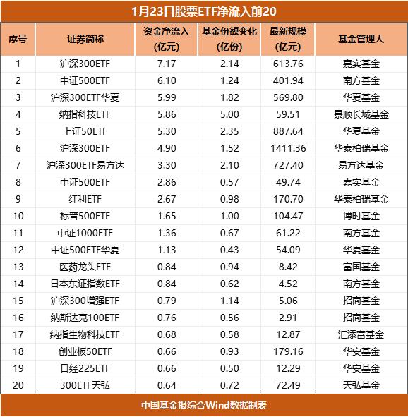 从资金净流入排行看,1月23日共有12只产品净流入超1亿元。其中,嘉实基金旗下沪深300ETF以7.17亿元的净流入排在首位,当日该产品基金份额增长2.14亿份。