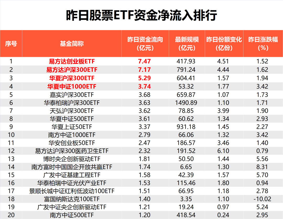 在前期“抄底”资金蜂拥而入背景下,股市大涨吸引资金进一步加码,昨日再有70亿元资金净买入,除了沪深300指数外,创业板指、上证50、中证500、中证1000指数也呈现“全面开花”,受到各路资金的追捧。而在大盘大涨中,净流出居前的多是行业ETF,半导体、人工智能、互联网等行业ETF出现一些净流出。