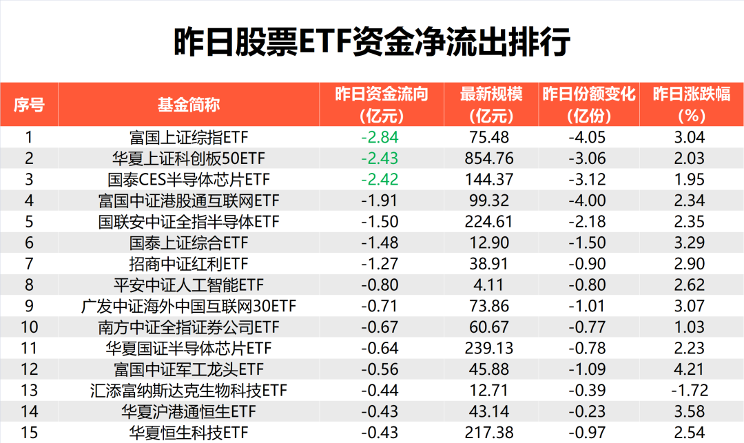 数据显示,昨日富国上证综指ETF、华夏上证科创板50ETF,净流出资金都超过2亿元,位居市场前两强。