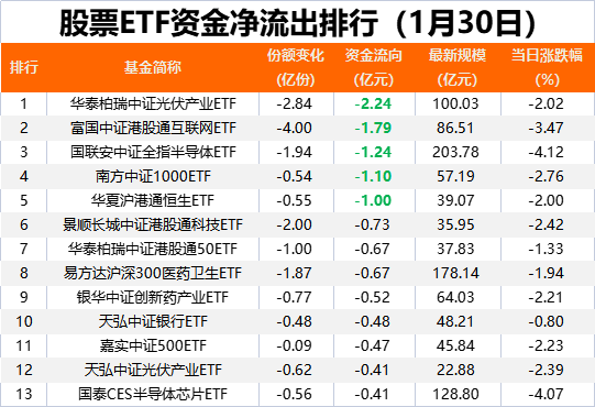 从昨日净流出榜单来看,华泰柏瑞中证光伏产业ETF净流出2.24亿元,富国中证港股通互联网ETF、国联安中证全指半导体ETF也遭遇较多净赎回。