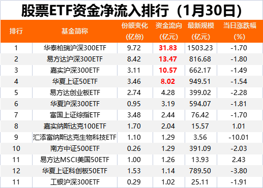 市场下挫中,1月30日股票ETF市场资金净流入86亿元,本周前两个交易日合计净流入达到百亿元体量。净流入方面,跟踪沪深300指数的股票ETF依然领先,华泰柏瑞、易方达、嘉实旗下的沪深300ETF合计吸金达56亿元;净流出方面,光伏、半导体等行业ETF以及港股ETF有一定净赎回。