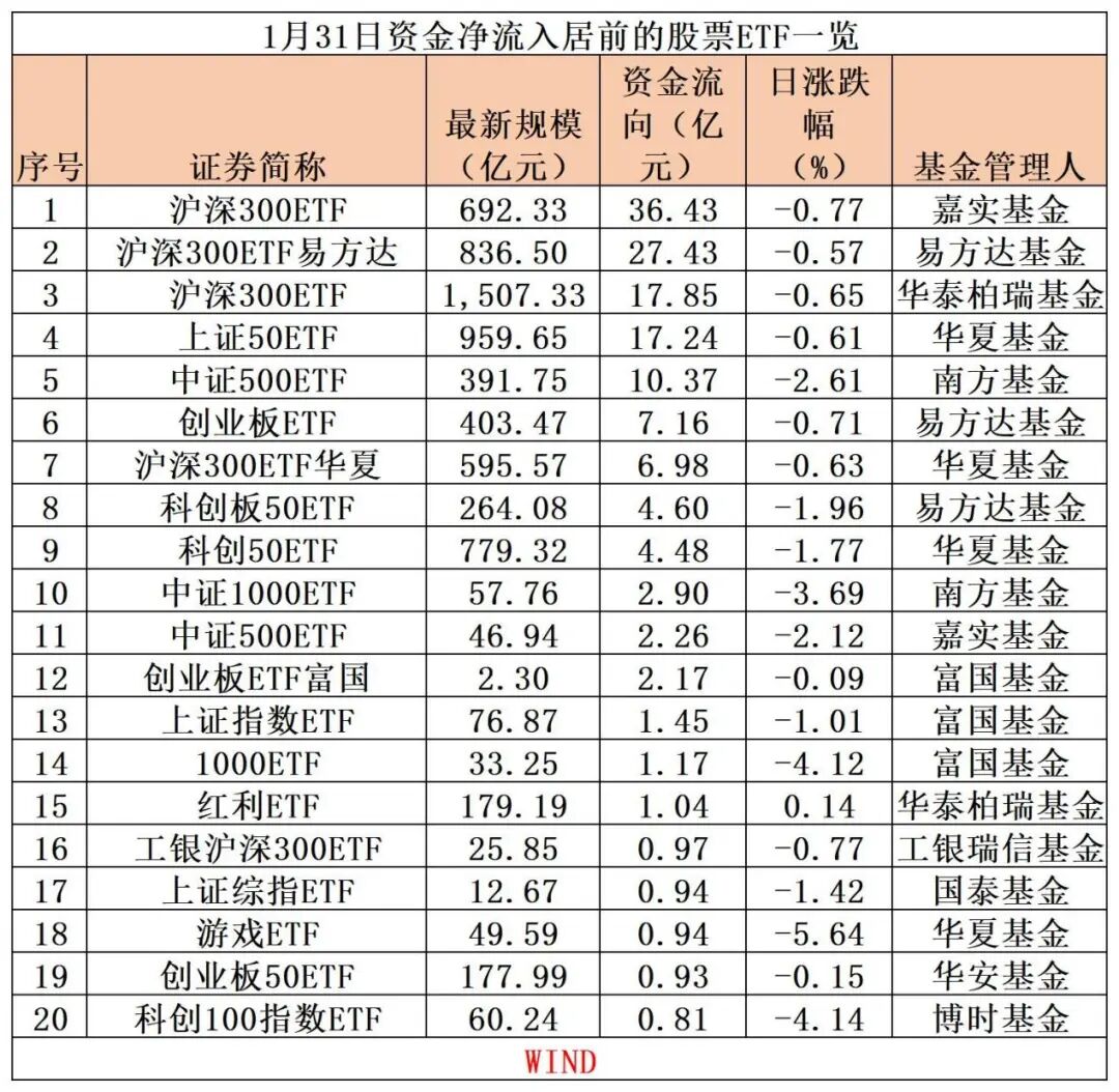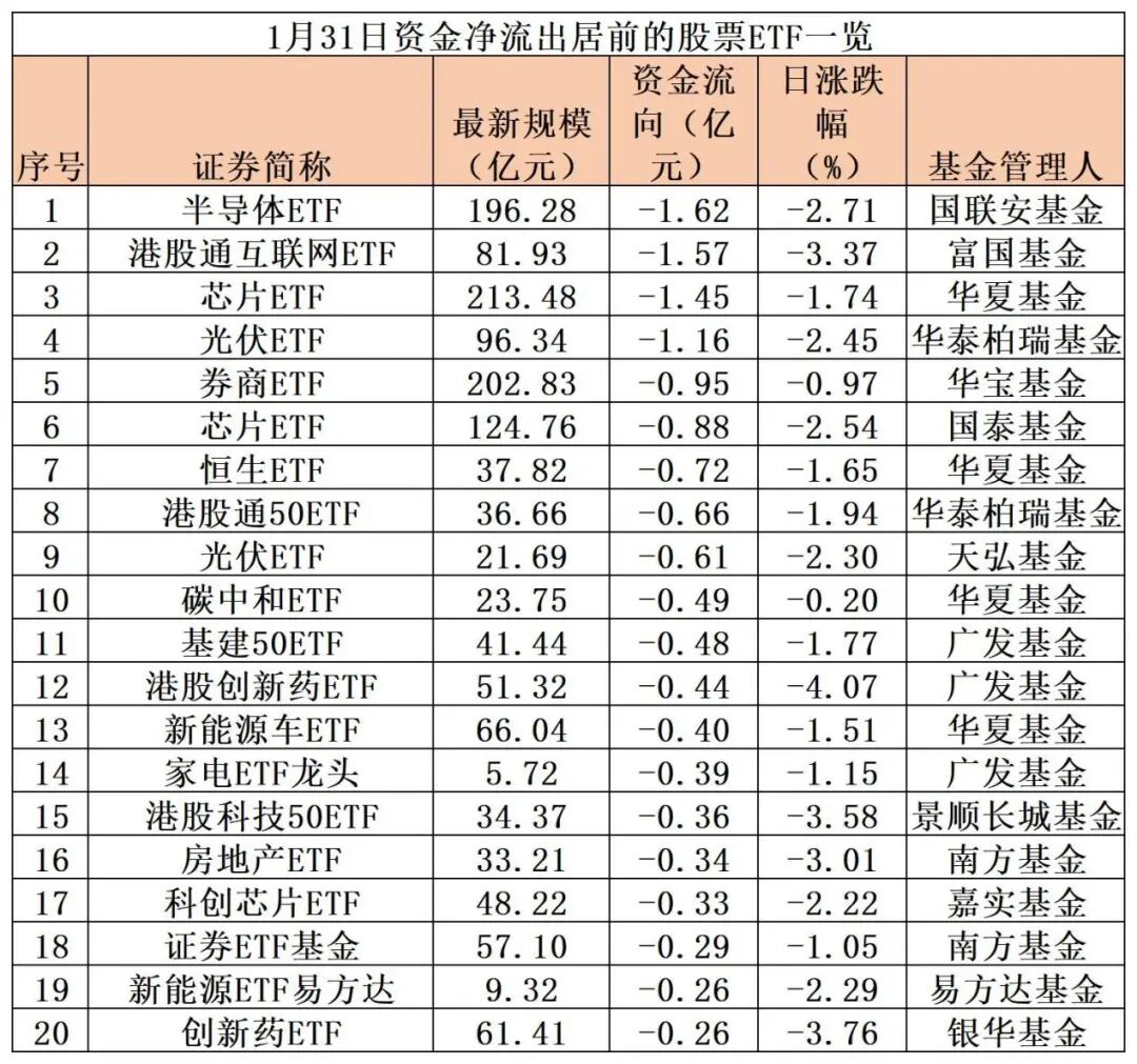 1月31日,1月份最后一个交易日,市场全天冲高回落,沪指再度失守2800点,仅煤炭、银行两个行业飘红,沪深两市股票型ETF合计资金净流入超150亿元。其中,沪深300相关ETF产品合计“吸金”超90亿元,占比六成,仍是当之无愧的“吸金”王。此外,半导体、芯片、光伏等一些热门赛道型ETF产品成为昨日“失血”主力。