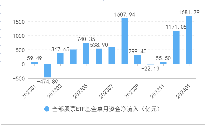 2024年首月,市场波动加剧,资金借道股票ETF加速“抄底”,单月合计资金净流入超1600亿元,创下自去年8月份以来单月资金净流入新高。