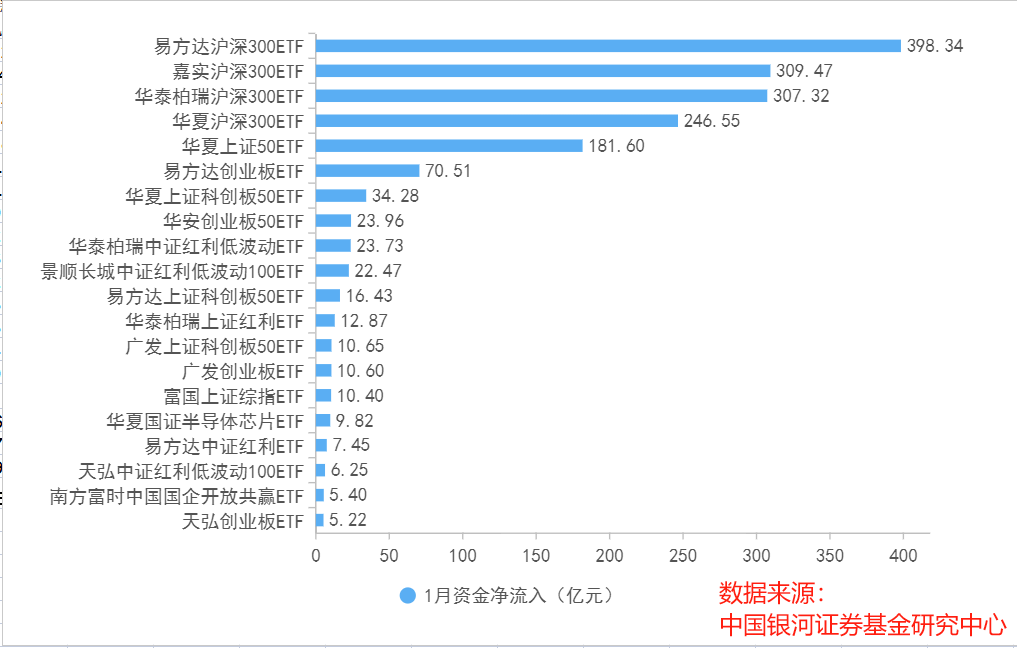 1月份,沪深300ETF产品“霸榜”。易方达沪深300ETF单月“吸金”达398.34亿元,嘉实沪深300ETF、华泰柏瑞沪深300ETF单月资金净流入分别为309.47亿元、307.32亿元,华夏沪深300ETF单月资金净流入达246.55亿元。此外,多只上证科创板50ETF、中证红利低波ETF、创业板50ETF、上证50ETF等产品单月资金净流入居前。