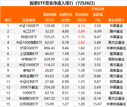 从资金净流入排行看,7月26日当天收盘,中证1000ETF、沪深300ETF等宽基指数,以及化工ETF、半导体ETF、家电ETF等行业指数产品受到资金青睐,资金净流入排行居前。