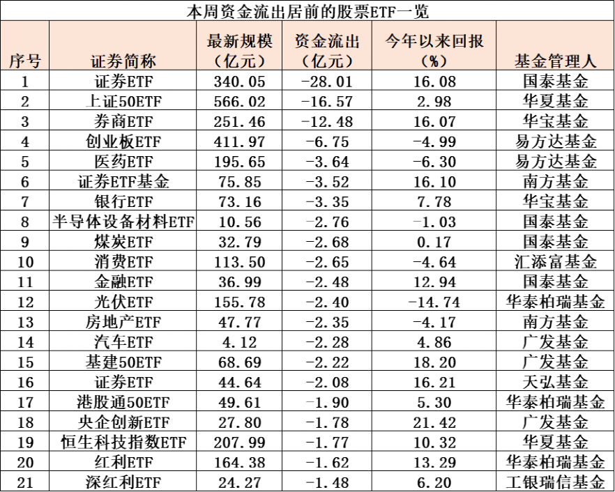 从资金净流出来看,本周券商、银行、房地产、消费、医药等细分行业ETF成为资金流出的主力军。比如,国泰证券ETF单周资金净流出超28亿元,华宝、南方、天弘旗下多只券商ETF产品也资金流出居前,在2-12亿元区间不等。回到盘面上,本周大金融板块带头冲锋,“牛市旗手”券商股爆发,多股掀起涨停潮,此外地产股及地产链也延续走强。与此同时,大金融相关ETF资金流出居前,颇有获利了结之意。除了大金融之外,还有多只红利、央企创新ETF本周资金流出位居前列。