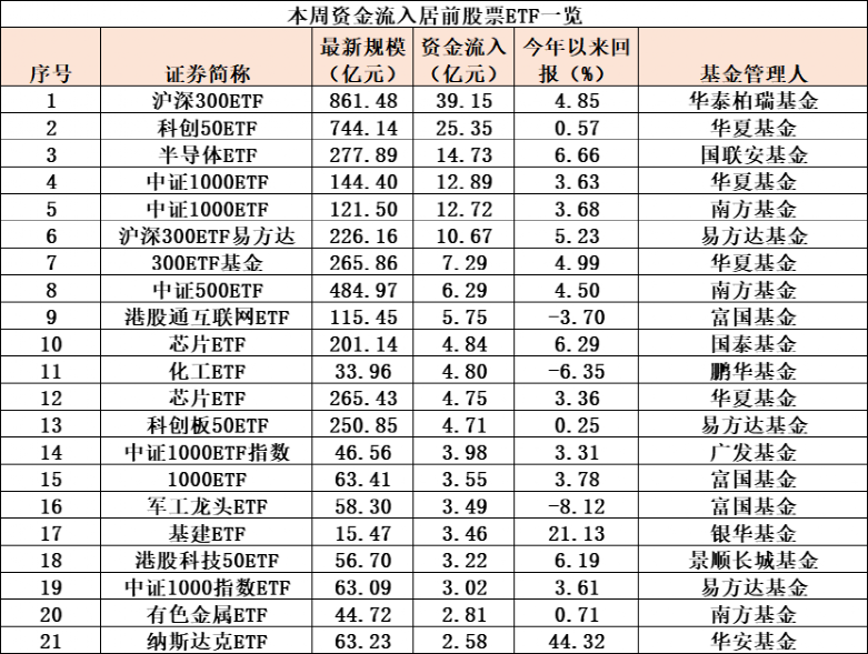 从资金净流入排行看,本周,多只沪深300ETF、科创50ETF、中证1000ETF资金净流入居前,此外,芯片、军工、化工、基建等细分行业ETF“吸金”居前。比如,华泰柏瑞沪深300ETF单周资金净流入近40亿元,华夏科创50ETF单周资金流入也超25亿元,此外华夏、南方旗下中证1000ETF单周“吸金”均超3亿元。