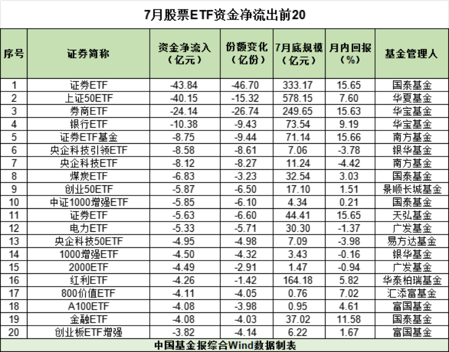 从资金净流出情况来看,7月券商、银行等大金融主题ETF“失血”居前,4只月度资金净流出超10亿元的产品中,有3只为大金融主题ETF。