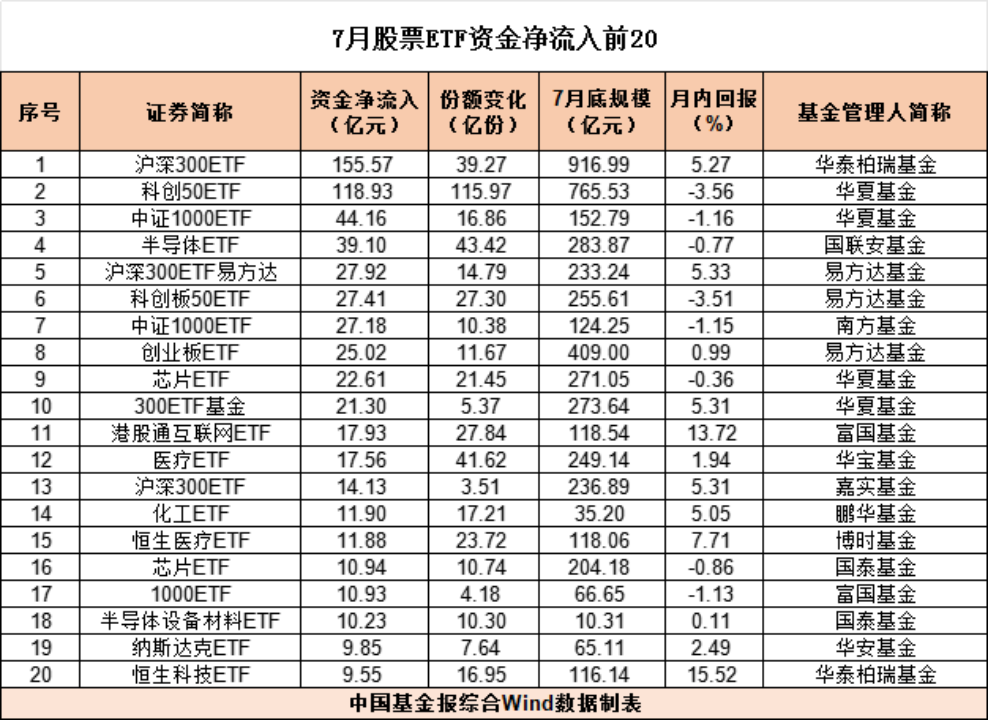 具体来看,宽基ETF仍是吸金主力,并有2只产品月内资金净流入超百亿。其中,市场规模最大的股票ETF产品沪深300ETF月内份额持续增长,至月底最新规模已突破900亿元,再创历史新高。此外,资金净流出方面,7月券商、银行等大金融相关ETF“失血”居前。