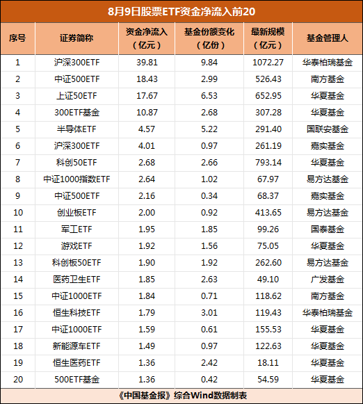 具体来看,8月9日,半导体ETF份额增加了5.22亿份,资金净流入4.57亿元,排在净流入榜单第五位。军工ETF、游戏ETF、新能源车ETF资金净流入分别为1.95亿元、1.92亿元、1.49亿元。医药卫生ETF、恒生医药ETF份额均增超2亿份,资金净流入分别为1.85亿元、1.36亿元。