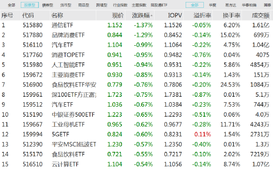 随着汽车、通信等板块调整,相关主题ETF今日跌幅居前。其中通信ETF跌幅达1.37%,品牌消费ETF跌幅达1.29%,汽车ETF、人工智能ETF等多只产品跌幅超0.9%。