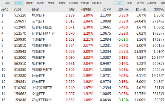 从股票ETF二级市场表现来看,今日能源主题ETF、券商ETF涨幅居前。具体来看,煤炭ETF、油气ETF、证券ETF基金位居前三,涨幅分别为2.89%、2.84%、2.39%。