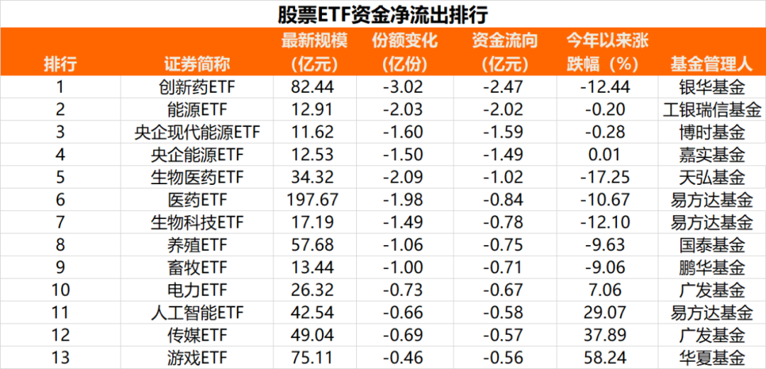具体来看,资金净流出居前股票ETF中,创新药、央企能源、养殖等股票ETF资金净流出居前。