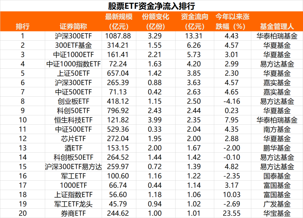 宽基指数方面,在最“吸金”的10只股票ETF中,悉数为宽基类。其中,华泰柏瑞沪深300ETF当日份额增加3.29亿份,至268.83亿份。以区间成交均价估算,当日资金净流入13.31亿元,吸金量领先各股票ETF;华夏沪深300ETF份额增加1.55亿份,至77.55亿份,资金净流入6.26亿元;华夏中证1000ETF份额增加2.21亿份,至62.30亿份,资金净流入5.73亿元。此外,易方达中证1000ETF、华夏上证50ETF、嘉实沪深300ETF、嘉实中证500ETF、易方达创业板ETF、华夏科创50ETF、华泰柏瑞恒生科技ETF、南方中证500ETF资金净流入均超过2亿元。
