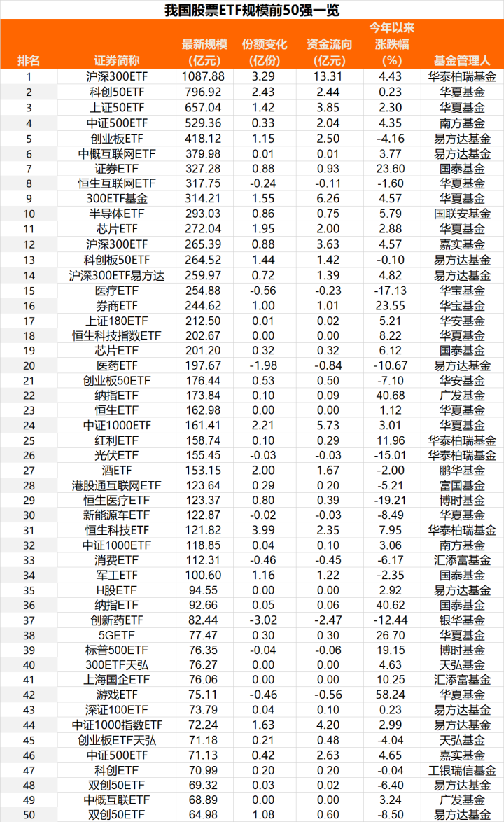 目前的市场格局中,华泰柏瑞沪深300ETF规模1087.88亿元,高居股票ETF规模首位,科创50ETF距离晋级800亿级阵营只有一步之遥,华夏上证50ETF同期规模超650亿元。此外,南方中证500ETF、易方达创业板ETF分别迈上500亿、400亿台阶。