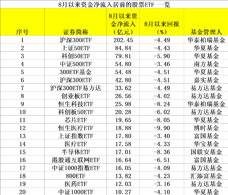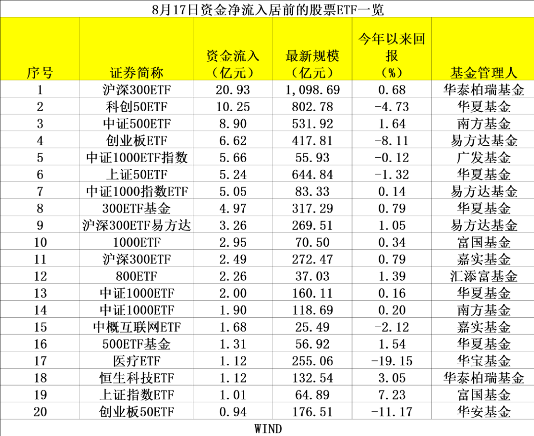 从资金净流入排行看,8月17日,沪深300、科创50、中证500、中证1000等相关ETF产品资金资金净流入居前。比如,华泰柏瑞沪深300ETF昨天单日就吸金超20亿元,紧随其后的是华夏科创50ETF,资金净流入超10亿元,富国、广发、易方达、华夏、南方旗下的中证1000ETF资金净流入在1-6亿元区间不等。