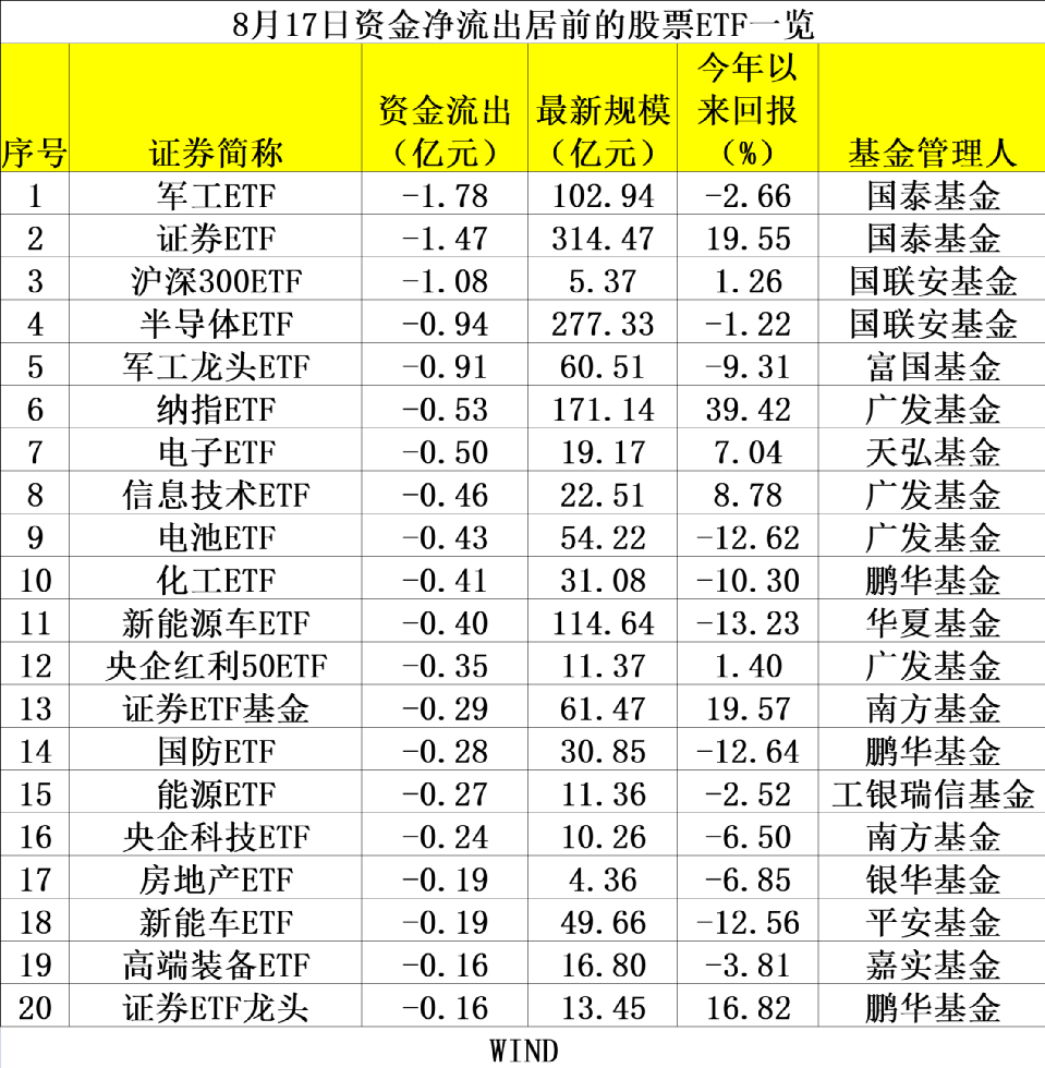 从资金净流出来看,8月17日,军工、证券、半导体、电子、电池、化工、房地产等多个细分领域ETF产品成为资金流出主力。比如,国泰军工ETF单日资金净流出1.78亿元,紧随其后的是国泰证券ETF单日资金流出也在1.47亿元,此外,国联安半导体ETF、富国军工龙头ETF单日资金净流出也均近1亿元。