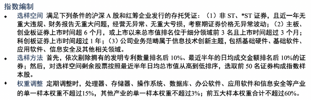 样本空间同中证全指指数的样本空间。选样方法分为三步:(1)对于样本空间内符合可投资性筛选条件的证券,选取涉及基础硬件、基础软件、应用软件、信息安全、外部设备等信息技术应用创新产业各细分领域的上市公司证券作为待选样本;