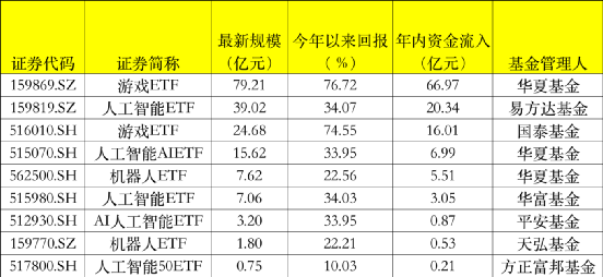 值得注意的是,蹭上AI东风,和游戏、人工智能、传媒相关的ETF份额一路上涨,最猛的年内份额增长超550%,相关ETF产品年内合计“吸金”超百亿。