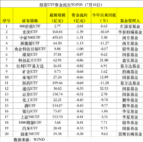 从资金净流出排行看,7月10日,800价值ETF资金流出居前,单日净流出2.01亿元,此外,光伏ETF、中证500ETF、新能源ETF当日资金流出均超1亿元。另有央企、红利、煤炭、家电相关ETF,资金流出位居当日股票ETF前20。