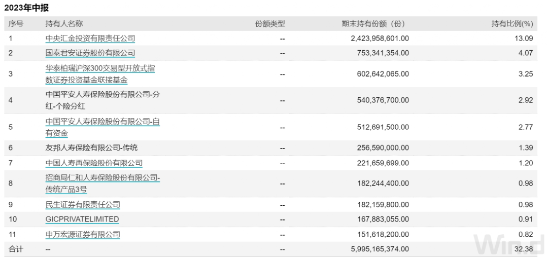 作为被机构持市值最大的ETF产品,截至半年报,华泰柏瑞沪深300ETF的前十大持有人出现不小变化。2022年末,基金第一大持有人为中央汇金投资有限责任公司,份额持有比例为12.31%,其他重仓持有人还包括联接基金、券商(国泰君安、华泰证券、广发证券等)、外资机构(汇丰银行)、保险机构(平安财险、友邦人寿、平安人寿),份额持有比例从5.82%到 0.87%不等;前十大持有人的合计持有比例为35.96%。