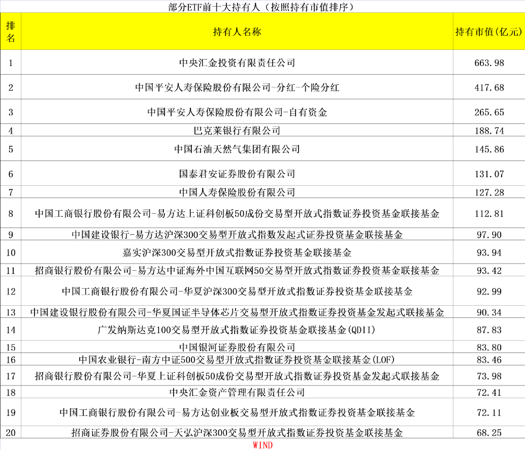 此外,巴克莱银行有限公司、中国石油天然气集团有限公司、国泰君安证券、中国人寿保险股份有限公司等持有ETF市值均超百亿元。