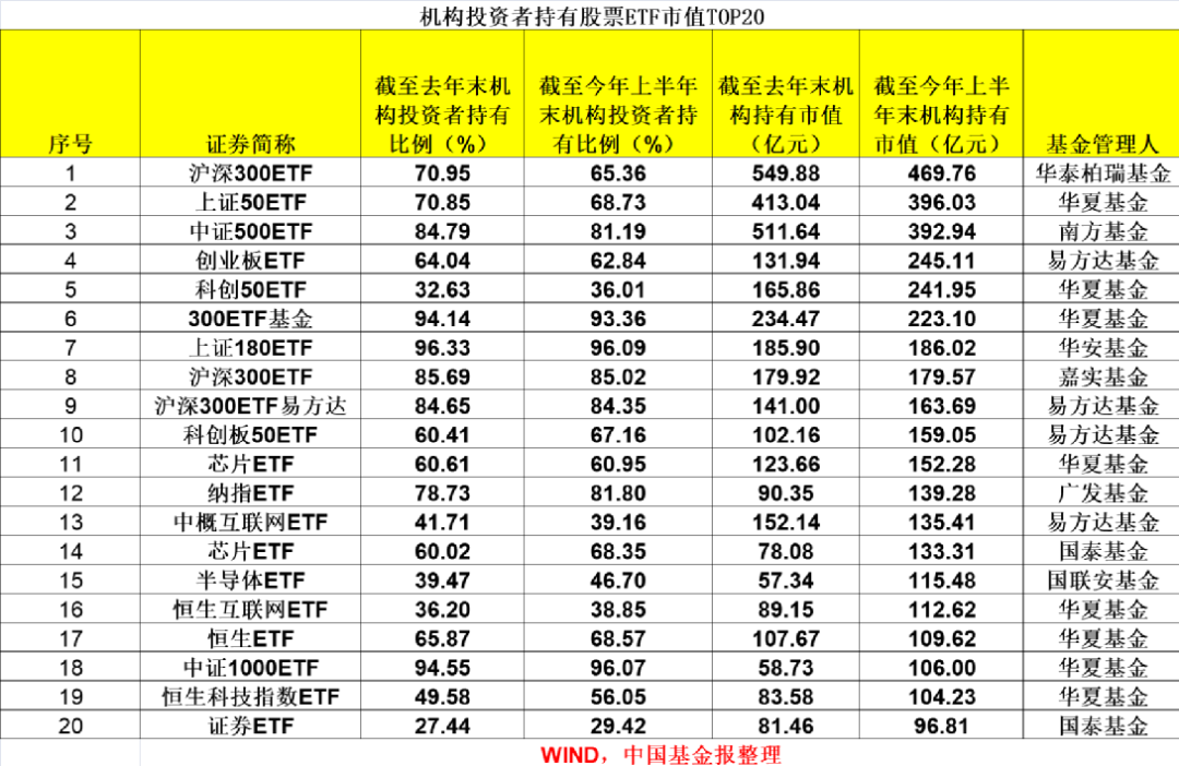 WIND数据显示,机构投资者持有股票ETF市值TOP20来看,机构投资者偏爱宽基ETF。被机构投资者持有市值最大的ETF产品是华泰柏瑞沪深300ETF。截至半年报,机构投资者持有华泰柏瑞沪深300ETF市值达469.76亿元,虽然较去年末的549.88亿元减少80.12亿元,机构投资者持有占比也从去年末的70.95%降至65.36%,但从机构持有市值来看仍然遥遥领先。