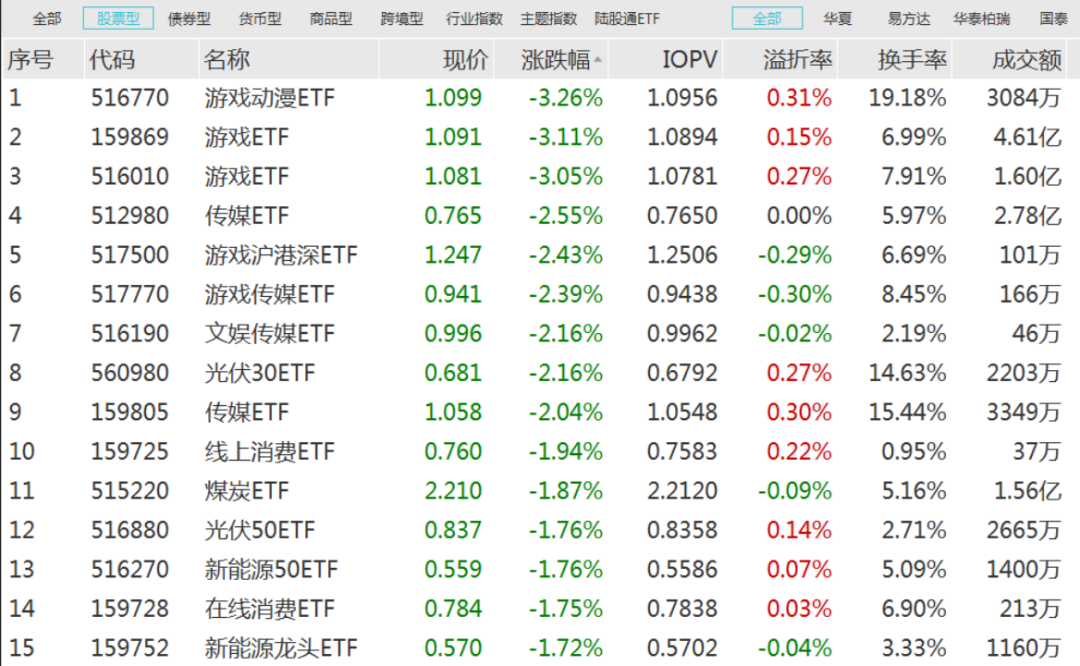 随着游戏、传媒等板块调整,相关主题ETF今日跌幅居前。其中,跌幅前三均为游戏主题ETF产品,今日跌幅均超3%。