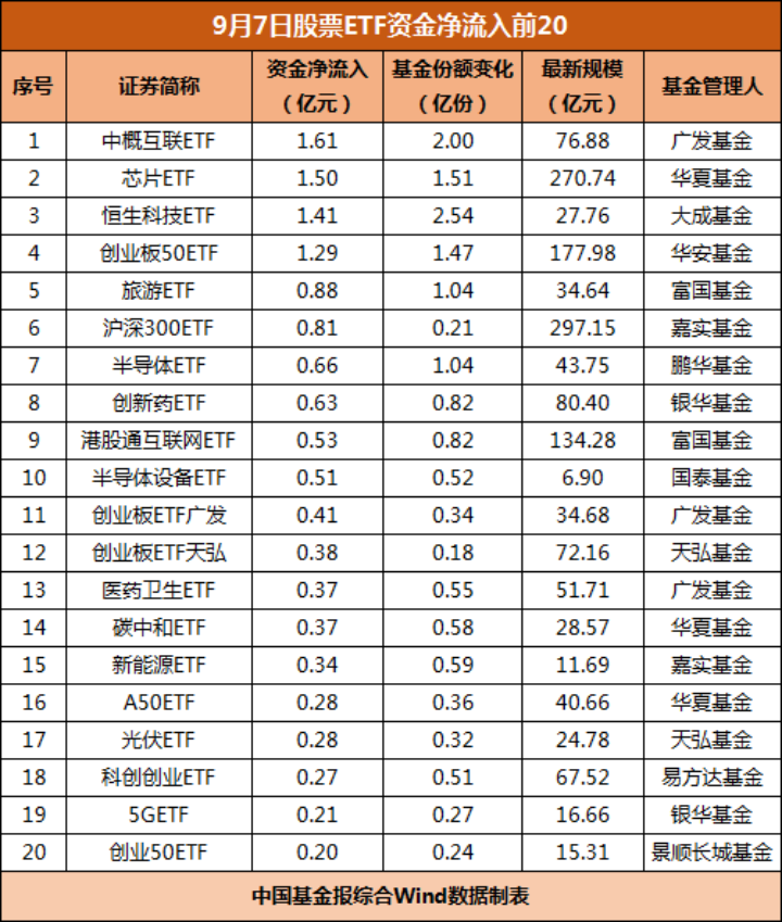从资金净流入排行来看,9月7日有4只产品资金净流入超1亿元。其中,中概互联ETF份额增加了2亿份,资金净流入1.6亿元;芯片ETF份额增加了1.5亿份,资金净流入1.5亿元;恒生科技ETF、创业板50ETF资金净流入分别为1.4亿元、1.29亿元。