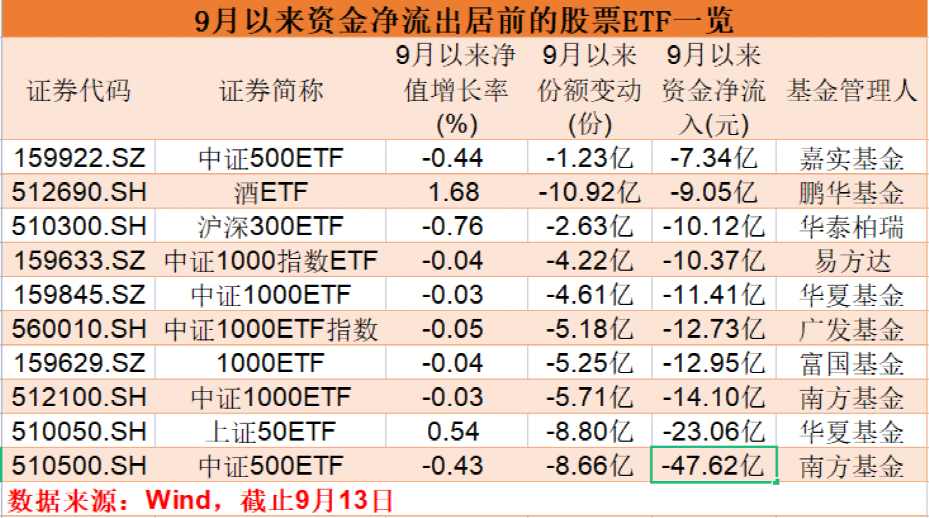 而在资金净流出方面,南方中证500ETF资金净流出超过47亿元,华夏上证50ETF资金净流出也超过20亿元。多只中证1000ETF也位居资金净流出榜前列,南方、富国、广发、华夏、易方达5家基金公司旗下的中证1000ETF合计资金净流出高达61.57亿元。