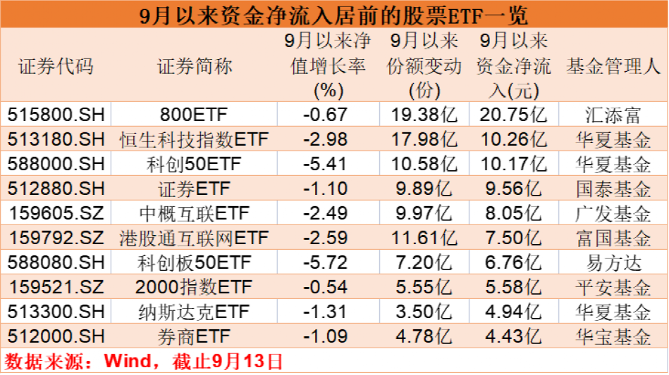 截至9月13日,宽基ETF中,汇添富中证800ETF自9月以来资金净流入达到20.75亿元,最新规模突破69亿元,创出上市以来新高,该基金也是目前唯一一只9月资金净流入超过20亿元的股票ETF。