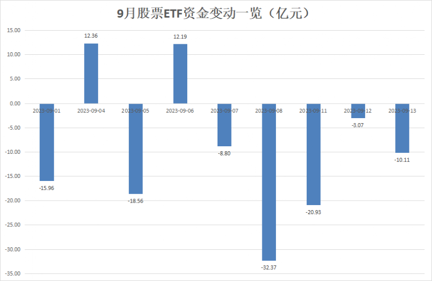 9月13日,A股主要指数跳水,尾盘有所拉升,沪指报收3123.07点,跌幅0.45%。银河证券基金研究中心数据显示,当日全市场股票ETF资金净流出10.11亿元,这也是自9月7日以来,连续第5个交易日出现资金净流出的现象。而自9月以来,股票ETF净流出金额已经超过85亿元。