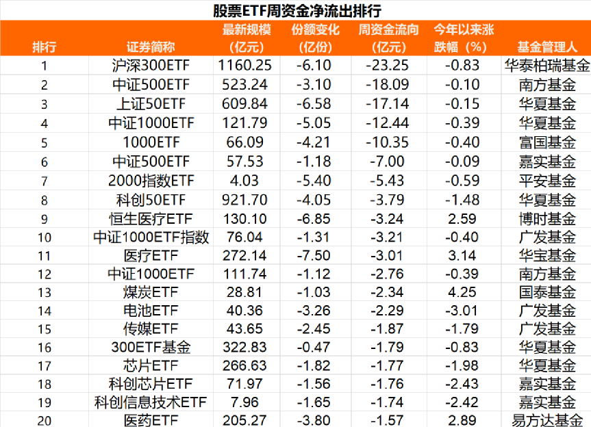 行业主题方面,博时恒生医疗ETF、华宝医疗ETF、国泰煤炭ETF、广发电池ETF、广发传媒ETF、华夏芯片ETF、嘉实科创芯片ETF和科创信息技术ETF,以及易方达医药ETF资金净流出也均超1亿元。