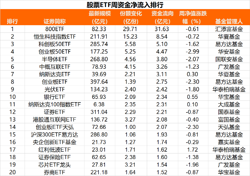 汇添富中证800ETF、华夏恒生科技指数ETF、易方达科创50ETF位居前三,本周资金净流入分别为31.63亿元、8.54亿元、5.10亿元。华安创业板50ETF、华夏纳斯达克ETF本周资金净流出超3亿元,另有易方达创业板ETF、大成纳斯达克100ETF、天弘创业板ETF、易方达沪深300ETF本周资金净流出也均超1亿元。