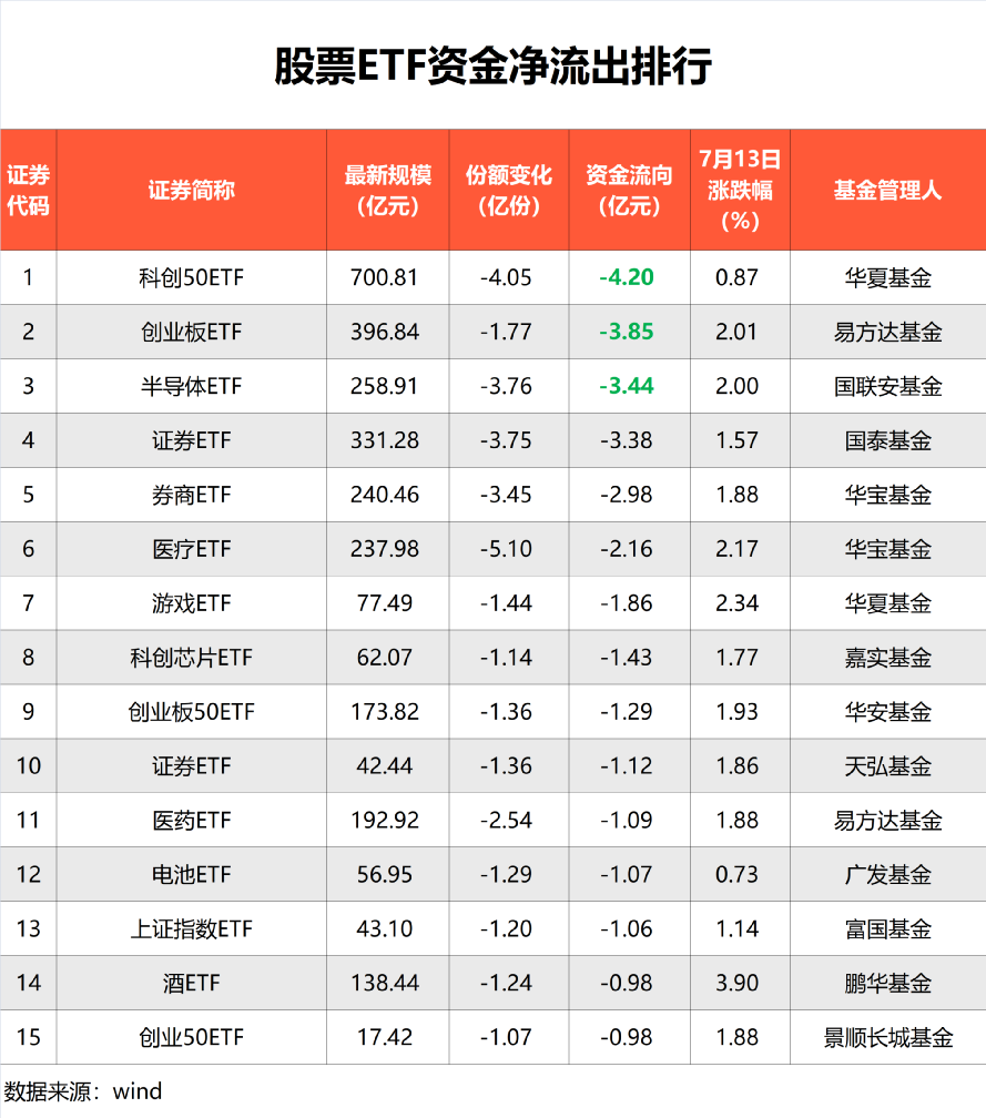 从资金净流出榜单看,宽基指数中,昨日科创50ETF、创业板ETF、创业板50ETF等出现了小幅的资金净流出,但相对于产品几百亿的体量,净流出资金相对较少。
