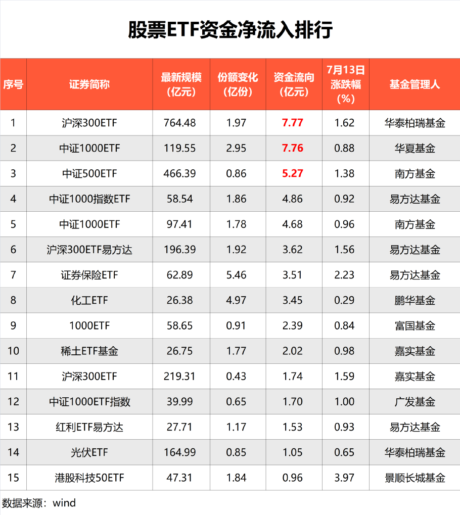 Wind数据显示,截至7月13日,在当日市场大涨行情中,全市场742只股票ETF总规模15082.59亿元,正式突破了1.5万亿元整数关口。