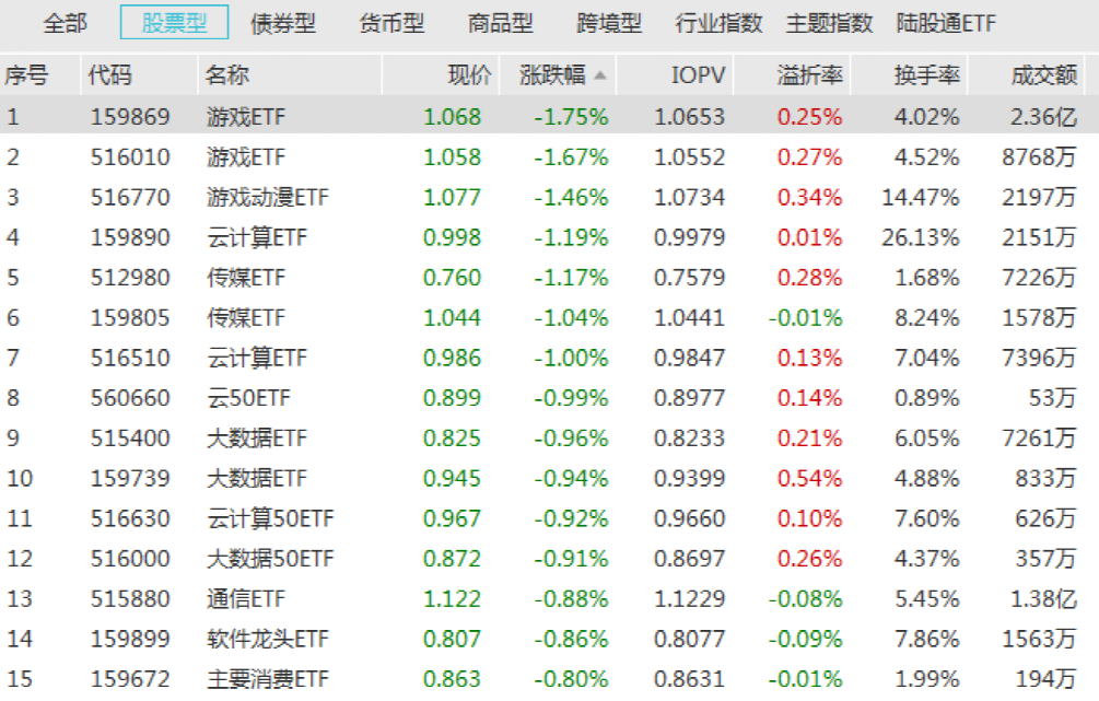 受板块调整影响,游戏、传媒、云计算等多只相关主题ETF跌幅居前。其中,游戏ETF以1.75%的跌幅居于首位。并有云计算ETF、传媒ETF等多只产品跌幅超1%。