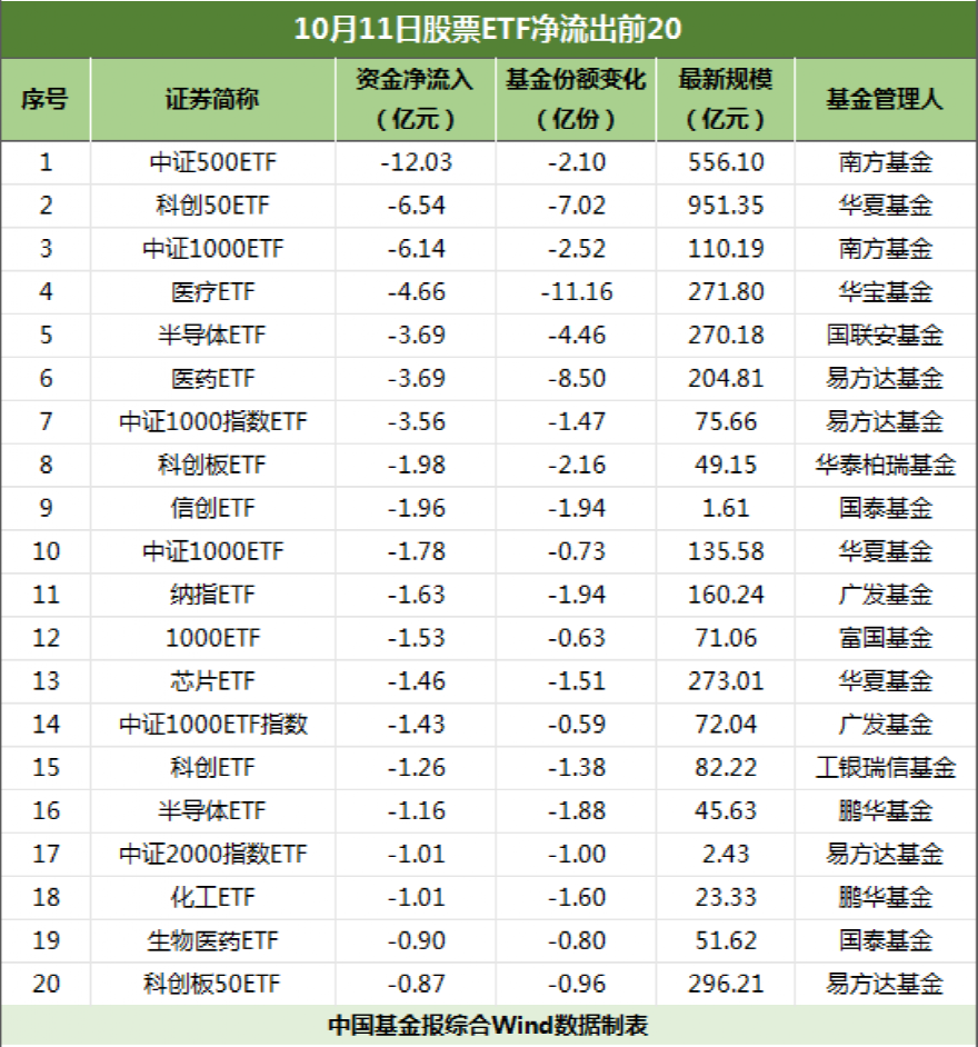 从资金净流出排行来看,10月11日也有多只宽基ETF遭资金大额赎回,其中,中证500ETF当时资金净流出达12.03亿元,位列第一。科创50ETF、中证1000ETF排在二三位,资金净流出均超6亿元。