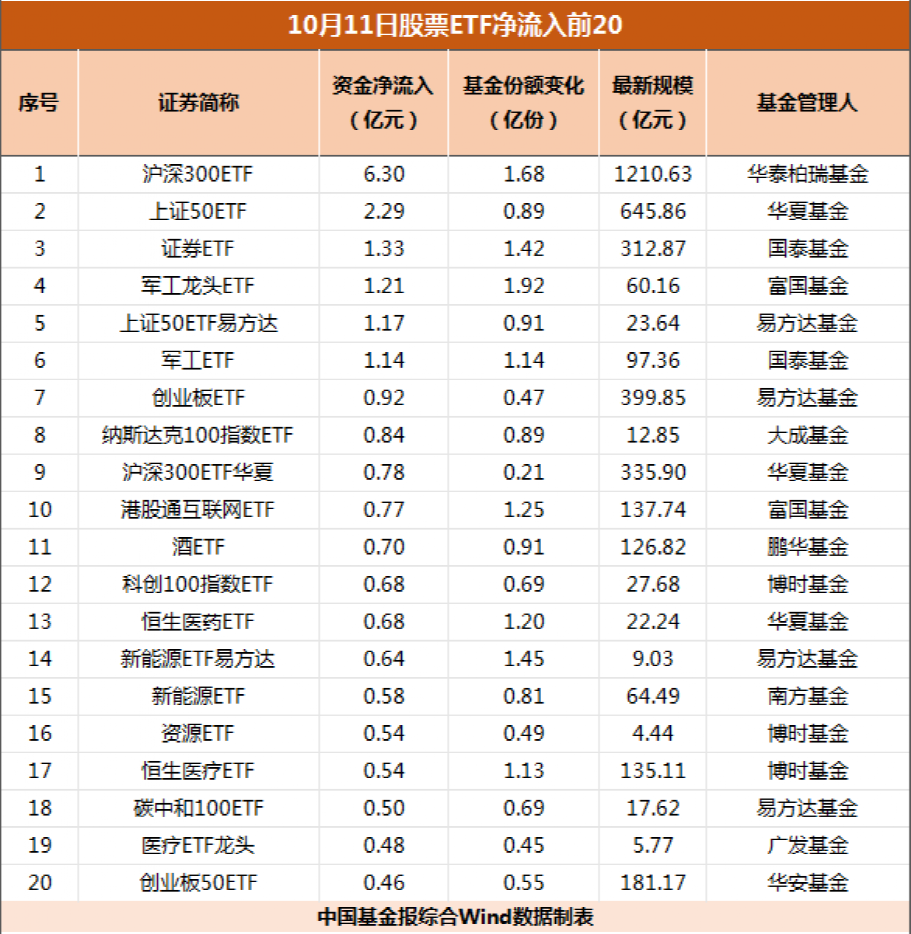 此外,有多只行业主题ETF获得资金青睐。其中,证券ETF以1.33亿元的资金净流入排在榜单第三位。军工龙头ETF、军工ETF则分别以1.21亿元、1.14元的净流入跻身前十。