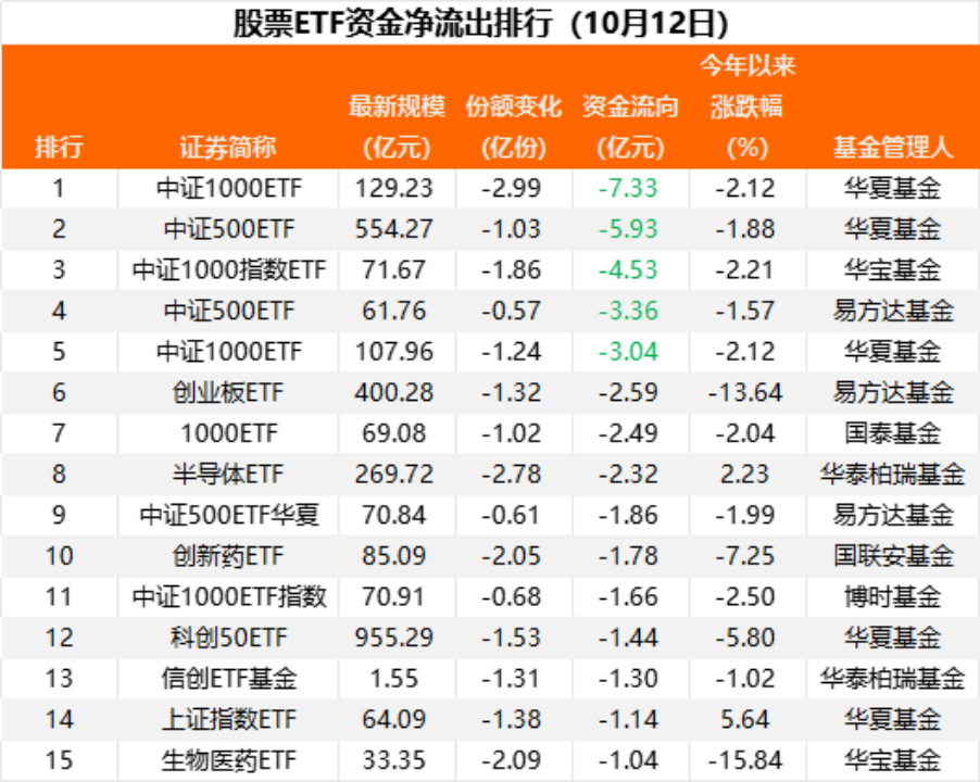 从资金净流出榜单看,一个明显的特征是,昨日净流出居前的15只股票ETF中,宽基ETF居多,尤其以中小盘风格的宽基指数ETF为主。