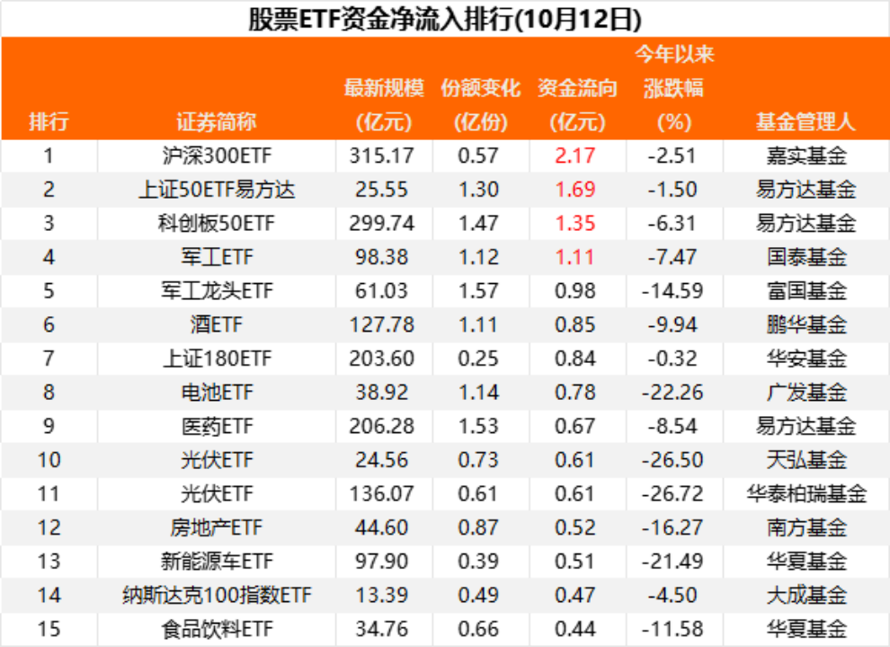 其中,多只中证500、中证1000等中小盘风格的宽基指数产品净流出居前,而沪深300、上证50等大盘宽基受到资金青睐,军工、新能源行业主题ETF资金净流入同样居前。