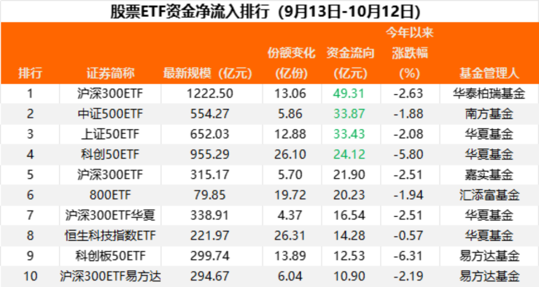 Wind数据显示,截至10月12日,近一个月以来股票ETF资金净流入排行中,前十均为宽基ETF产品,大盘、中盘及聚焦科创板块的小盘成长风格的基金都在其中。
