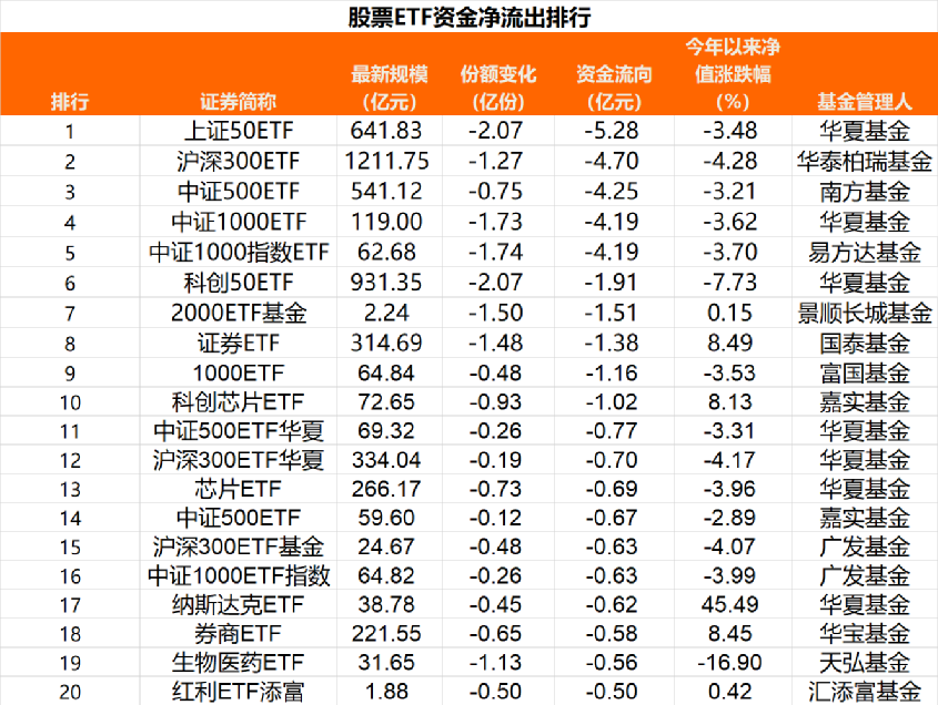 从资金净流出情况来看,上证50ETF、沪深300ETF、中证500ETF、中证1000ETF、科创50ETF等宽基ETF“失血”居前。