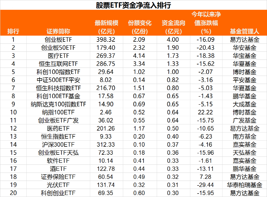 宽基方面,易方达创业板ETF当日资金净流入4亿元,华安创业板50ETF净流入1.90亿元。此外,博时科创100指数ETF也有约1亿元净流入。