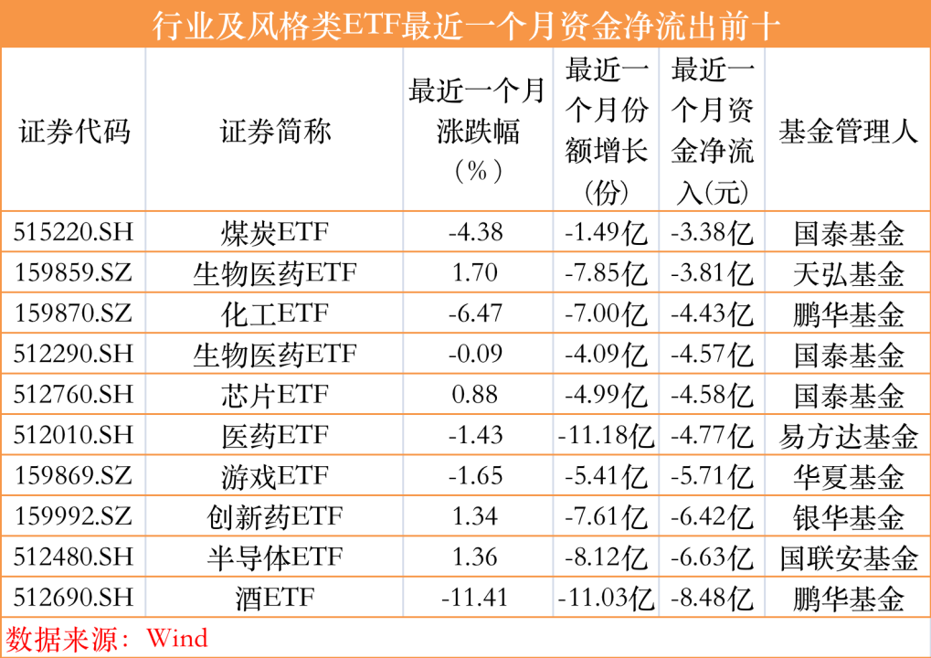 而在资金流出方面,鹏华酒ETF超过8亿元,国联安半导体ETF、银华创新药ETF也分别有超过6亿元的资金净流出。